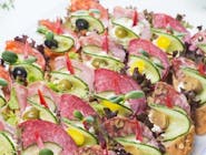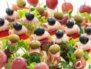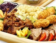Do wyboru 4 rodzaje mięsa po 5 szt. z każdego rodzaju. Do wyboru: Rolada wieprzowa, szaszłyk drobiowy, pieczeń wieprzowa, udko z kurczaka, de volaille drobiowy z masłem, kotlety czopskie w sosie śmietanowo -pieczarkowym , filet z kurczaka, tradycyjny kotlet schabowy, żeberka wieprzowe, golonka pieczona w piwie z jałowcem, nuggetsy z kurczaka.